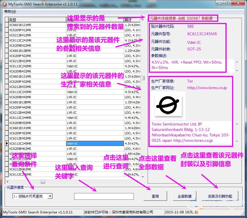 软件集成了三极管数据库、场效应管数据库共近8万条数据,大量的1:1图片(企业版)详尽的参数,是电子爱好者必备的工具软件此软件最大限度的搜集了世界各国晶体管生产厂家的产品,其中囊括了200多个生产厂家近8万个晶体管的详细信息。每一个晶体管均提供国内外相似替换器件型号。并且数据库不断地升级。每天几乎都有新的数据添加。您可以不费吹灰之力找到您需要的信息。该软件内置一个功能强大的搜索引擎,多种的查询方式能满足您不同的要求。同时我们公司将对合法用户进行全费软件后续版本的升级。其主要查询方式有:按型号查询、按工作电压查询(支持:>,<,<=,=,>=,xx值-xx值,)、按工作电流查询(支持:>,<, <=,=,>=,xx值-xx值,)、按工作频率查询(支持:>,<,<=,=,>=,xx值-xx值,)、按功率查询(支持:>,<,<=,=,>=,xx值-xx值,)、模糊查询等. 为了满足不同人士和企业的需要我们把软件分为两个版本:专业版和企业版。专业版: 此版本具备软件的全部功能,支持用户自己自动、手动升级核心数据库。不支持数据库导出功能,不提供晶体管的外形视图。软件尺寸:40MB载体:光盘企业版: 此版本具备软件的全部功能,支持用户自己自动、手动升级核心数据库。支持数据库导出功能,提供晶体管1:1外形视图(1108外形幅图片)。【使用方法】