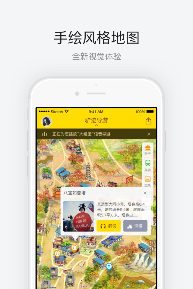 1、语音导游:专业主播录制的景点讲解及到点播报,多语种支持,走到哪儿听到哪儿。2、手绘地图:为景区量身定制手绘卡通地图,让您轻松看懂地图,永不迷路。