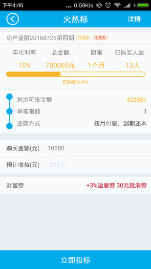 (2)投标:充值成功后,首页登录“我要理财”页面,进入投资项目列表,选择符合您需要的申购项目,点击项目栏右侧“投标”按钮完成投资。