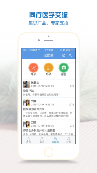病例讨论,打造专业宠医社交,并有专家指导。3.宠主: