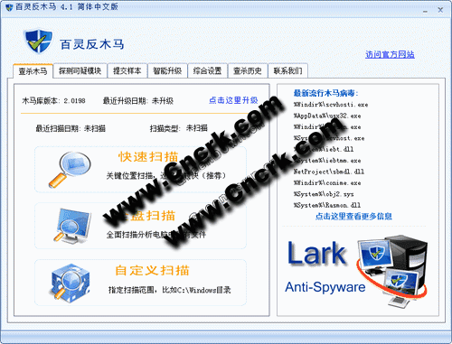 《百灵反木马》是一个免费的木马查杀软件,拥有上百万的木马库,更有效的检测并清除木马程序、广告间谍、后门程序、流行病毒等恶意文件,您不仅可以扫描系统关键位置,也可以全盘扫描、自定义扫描,界面友好,操作一目了然