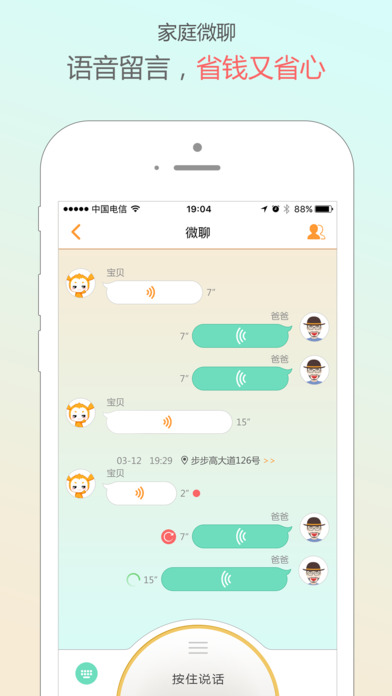 手表和app之间可以相互发送语音信息,实现孩子与家长之间一种新的沟通方式。除此之外,app端还可以发送微聊文本给手表,微聊沟通多样化。