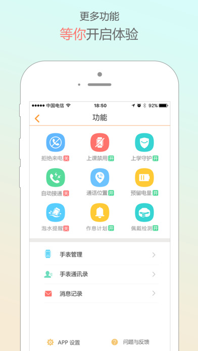 1.电话功能:手表硬件有电话模块,可以实现手机与手表、手表与手表之间互打电话,方便家长与孩子之间的沟通联系。除此之外,手表端还可自由切换普通、隐私模式,通话更自如。