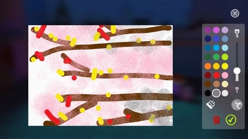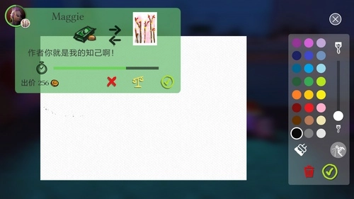 玩家需借助右边的画板,在白纸上创作属于自己的作品,完成后便可摆出售卖。只要所画作品能赢得NPC的青睐,他们便会根据喜好程度,以不同价格购买画作。