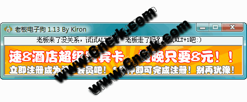 防老板电子狗 V1.13 简体中文绿色免费版 还在为在老板眼皮子底下玩游戏发愁吗?试试防老板电子狗吧,完全绿色软件,个头小,速度快,可以最小化到托盘,不占空间,一键切换桌面.相当于你有了两台电脑,一个桌面玩游戏聊天,一个桌面办公,老板来的时候,一键切换到办公的桌面,如果老板走了,呵呵......