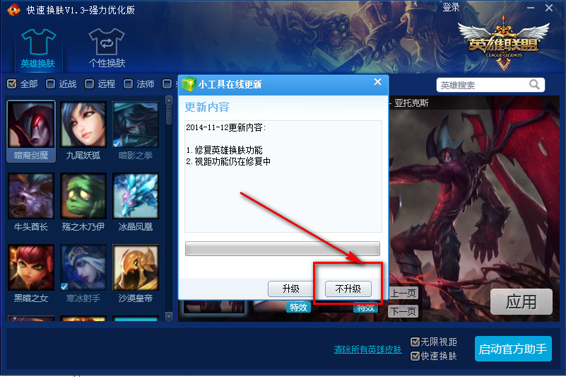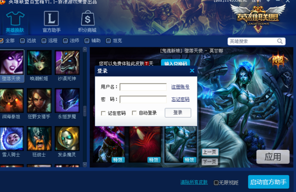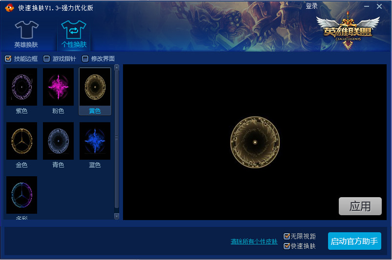 3、点击"英雄换肤" 标签,即可查看到英雄换肤界面,左边显示了所有英雄的头像,当鼠标点击任意一个头像,右边则对应显示出该英雄可用的皮肤大小缩略图,点击小图、再点击右下方"应用"按钮,提示应用成功,说明皮肤已成功替换,接着点击右下方"启动游戏" ,开始你的皮肤体验旅程!