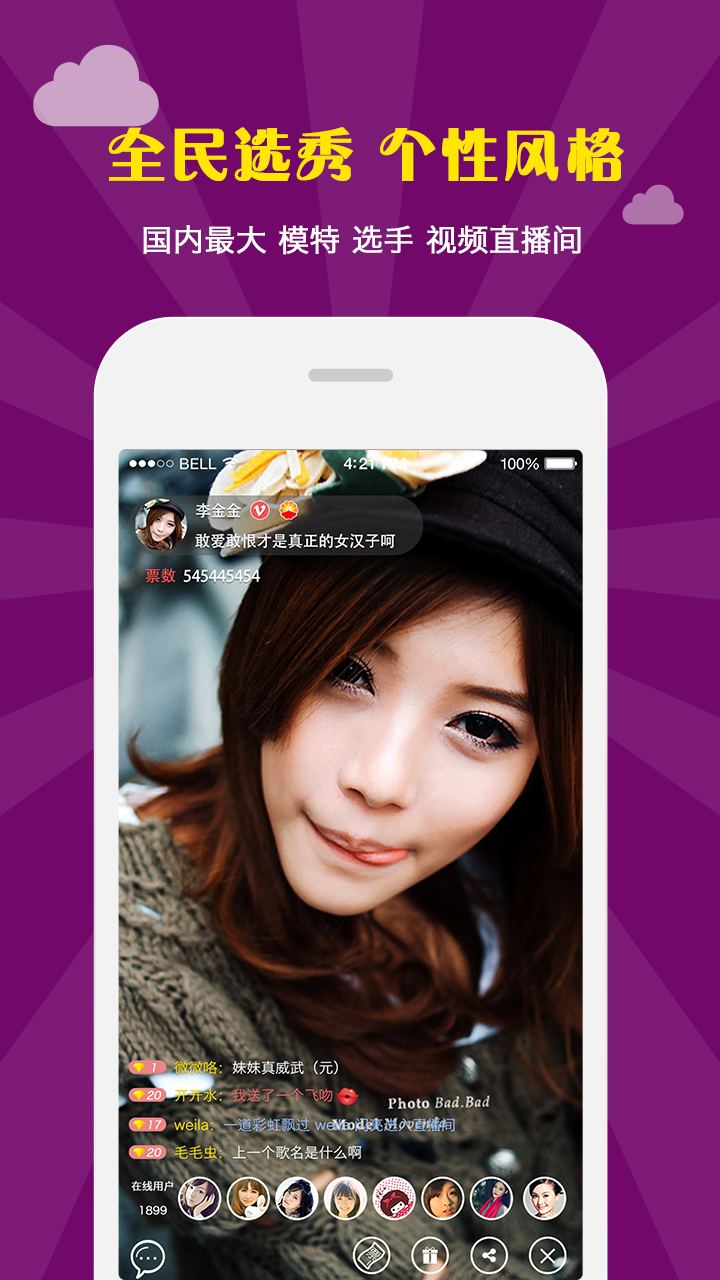 火爆的选美赛事,高质量的视频画面,Live现场的音效,炫丽丰富的礼物,让你如同置身于火热赛事现场!