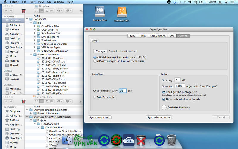 Crypt Sync Files Mac版是一款文件加密工具,Crypt Sync Files Mac版支持使用 AES256 或者是带密码的 ZIP 文件加密两种方式,同时它还是一个文件同步工具,可以帮你将加密后的文件同步到网络空间、NAS、外部存储器等空间中。【软件特点】