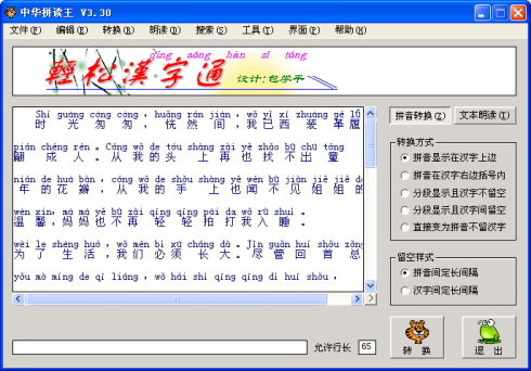 本软件提供了强大的汉字拼音分行对照转换、汉字拼音分段对应转换、拼音位于汉字之后和只将汉字转换为拼音等各种转换形式,操作时只要打开要转换的中文文本文件,并选择一种转换方式,点转换按钮,只要一会儿,就会让你得到你想要的结果。