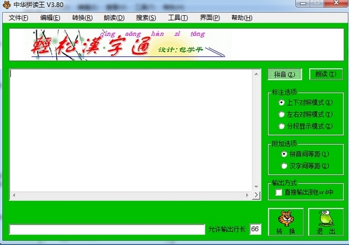 中华拼读王是一款非常强大的汉字拼读软件,您可以导入本地的文本文件,也可以手动录入,软件会自动对您输入的汉字标注拼音,帮助您学习汉语,软件内置语音引擎,可以非常准确清晰的将您输入的内容朗读出来,让您掌握正确的发音。【软件特点】