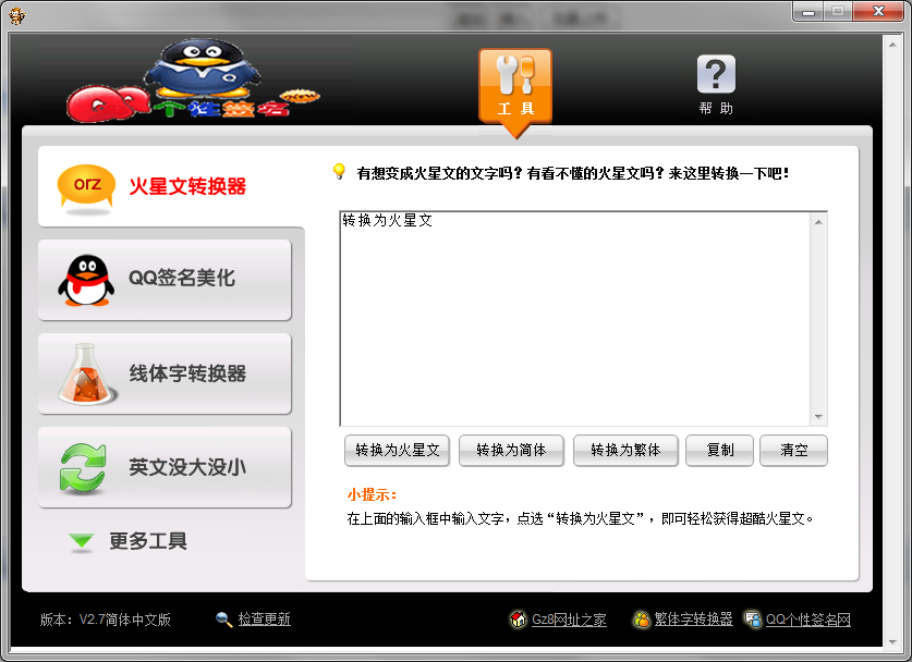 非主流火星文转换器是一款功能强大的火星文在线转换工具,非主流火星文转换器提供火星文、非主流繁体字、线体字、签名效果、菊花文转换等功能,用户可以非主流火星文转换器将简体中文字体快速转换为神奇的火星文字体,在聊天的时候可以显得很有个性。