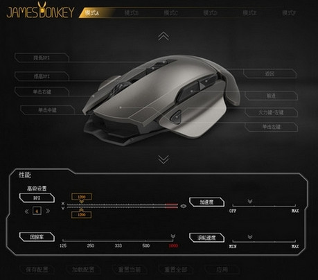 1、性能一栏则可自定义设置五档DPI、加速度、滚轮速度、回报率等一些常规的东西,其搭载的安华高A9800允许用户在50-8200DPI之间以每档50作为步进自行设置DPI。