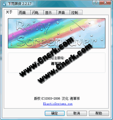 Rainy Screensaver V2.2.17 汉化纯净安装版 Rainy Screensaver 是世界上最好的下雨屏幕保护程序之一,它真实地再现了雨天的景象,当雨点随风而降,在逼真的雨声、炫目的闪电和滚滚的雷鸣声中,雨点在屏幕上汇集滑落,会让人感觉到电脑屏幕上真的下起了一场暴雨。你可以选择自己喜爱的一组图片作为桌面背景,程序将逐一加载并转化为雨天效果,图片能够以随机或指定顺序显示出来,程序也可以在指定的时间段内重复运行