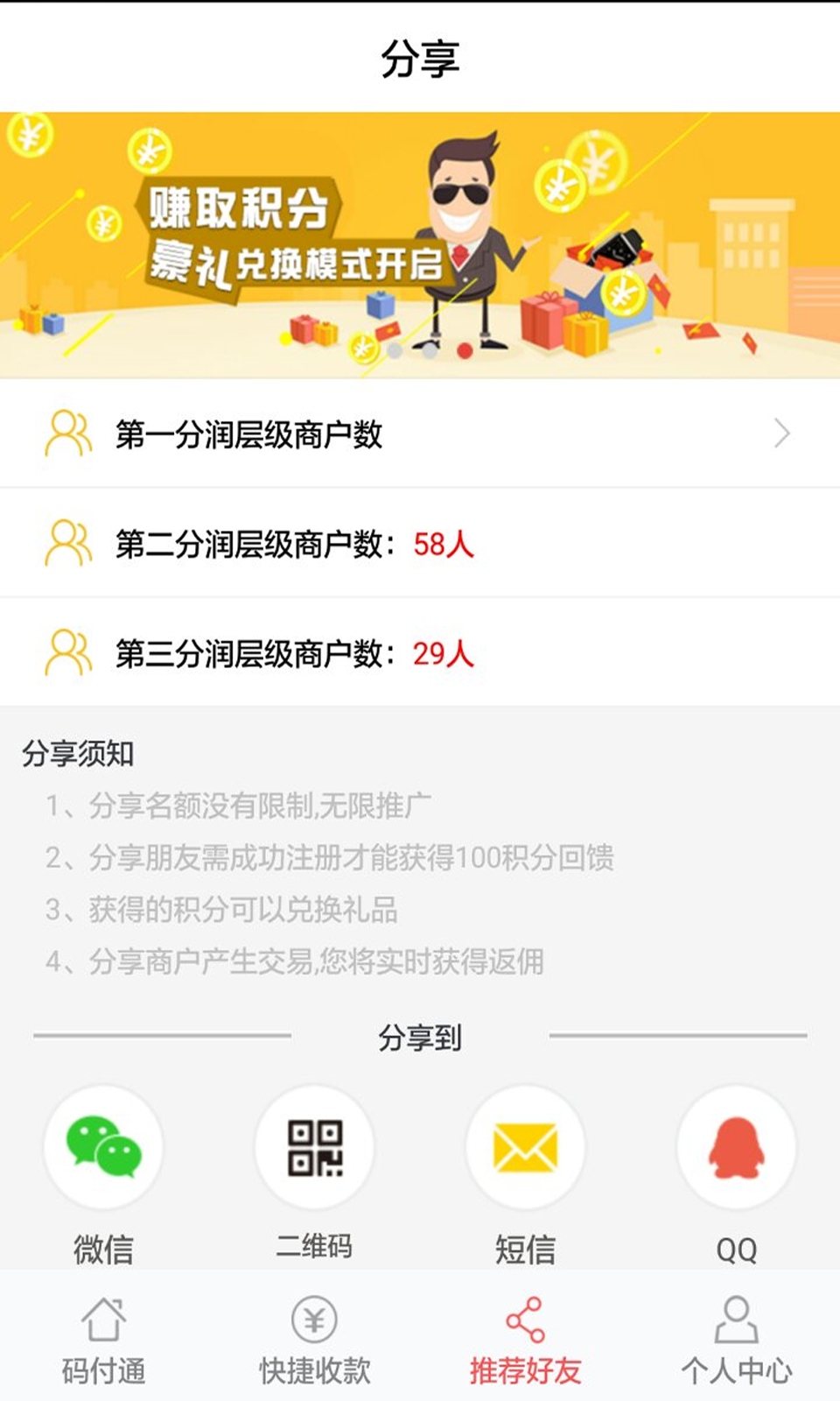 码付通,扫码支付品牌,手机秒变POS机。码付通秉承“安全便捷,和谐共赢”的品牌理念,力求打造一个最贴心的收款平台,同时也是最合适的创业平台。码付通以市场需求为导向,以多年行业经验为基础,以专业技术实力为依托,将市场需求与品牌理念完美融合,倾力打造扫码支付品牌,打造“互联网+”时代的最有使用价值的电子钱包,打造更适合未来支付市场需求的产品。码付通适合个人客户和实体店以及各类企业客户,支持微信扫码支付、支付宝扫码支付、百度钱包扫码支付、京东钱包扫码支付、银联钱包扫码支付、银联快捷支付等。码付通,无需硬件,只要安装一个软件,手机秒变POS机,开启财富之门,推荐更享高收益,真正0投入,创业就这么简单。【功能介绍】