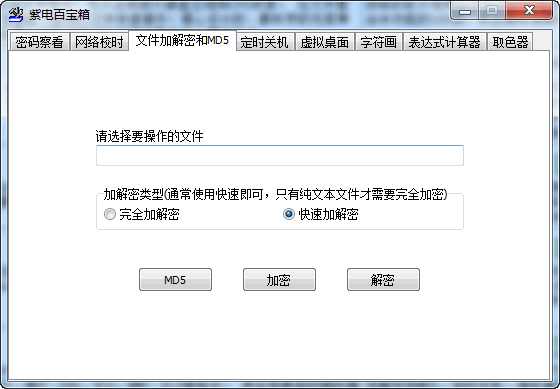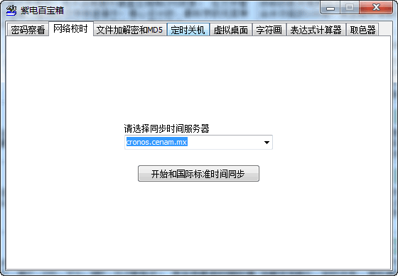 紫电百宝箱是一款绿色免费的网络工具合集软件。该软件界面清爽简约,功能比较强大,拥有密码查看、网络校时、文件加解密和MD5、定时关机等工具 。