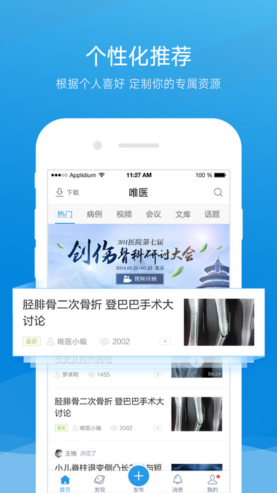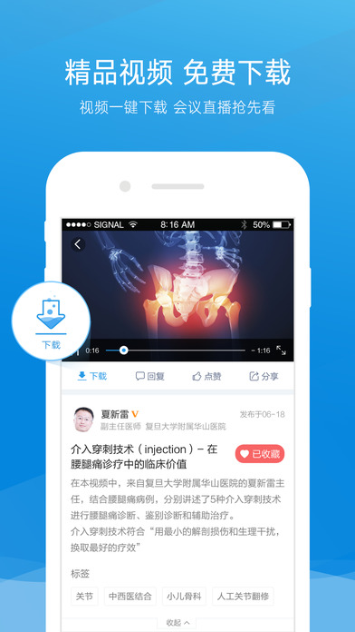 可能汇聚了最丰富的骨科资源,对,就是各种手术视频、会议回放、病例解析、热门话题等等等等都有的那种,问了很久的视频怎么下载,终于搞定了!工作那么辛苦的你,终于可以随时随地各种姿势任性的看视频了。诊疗中遇到不明白的问题怎么办?发出来大家讨论啊,随便的话题也行,完整的病例也行,只要你发就有人答,再强调一下,大佬都在!