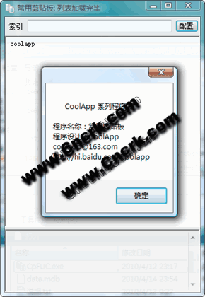 常用剪贴板程序 V1.1 简体中文绿色免费版 常用内容保存到数据库,通过主题或索引快速查找到内容,双击标题复制到Windows剪贴板上。 使用前需要将常用内容录入到数据库。填写适当标题的和索引(缩写)。使用时浏览标题列表或在索引器里输入缩写的字母、数字或词汇找到合适的项目后双击就复制到了Windows剪贴板。