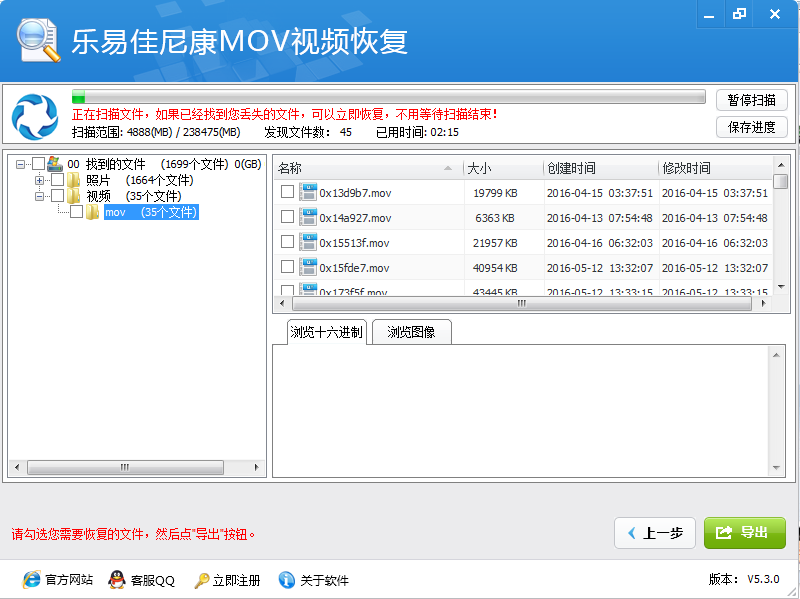第三步、浏览找到的MOV文件,根据需要勾选文件,点击"导出"按钮。