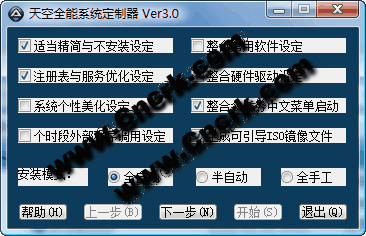天空全能系统定制器 V3.0 简体中文绿色免费版 目前国内系统定制技术已成为广大电脑爱好者的兴趣及发展目标。又因为定制系统需要有一定的扎实功底,以及繁琐的各种软件操作、配置文件的修改和文件的归类安排叫人头疼。因此本站开发出了可将以上繁杂工作简单化让各类软件的操作及配置文件修改以及文件归类安排一气合成,让你轻松几步就可以订制属于您的个性化系统。使用该软件不需要任何高深知识,只需简单填写必要信息即可完成。若您实在菜鸟实在不懂,也没关系,已为您准备了上述所必要的默认参数,即使不采取任何改动也能合成您的个性化系统。