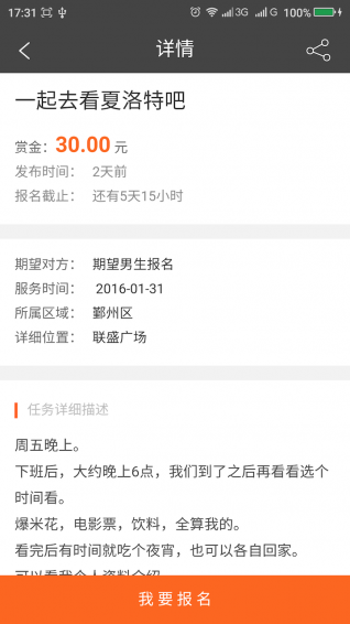 当你无聊、寂寞、需要人陪伴的时候,来黄花树,可以快速找到愿意陪你逛街、吃饭、K歌、看电影、爬山…的人;你需要做的,仅仅是来黄花树发布一条赏金任务。如果你有很多空闲时间,也可以到黄花树报名其他用户的赏金任务,吃喝玩乐的同时,还能赚到赏金哦。
