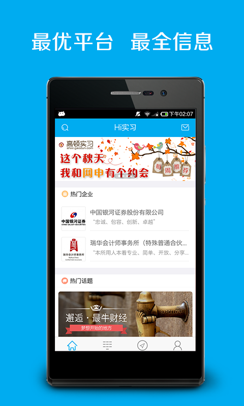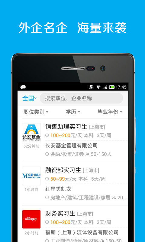 Hi实习,专注大学生财经实习机会。500强企业,4大会计师事务所,都在这里招聘实习生。【实习搜索】多维度实习搜索,输入关键词,联想搜索职位,高效聚焦心仪实习。