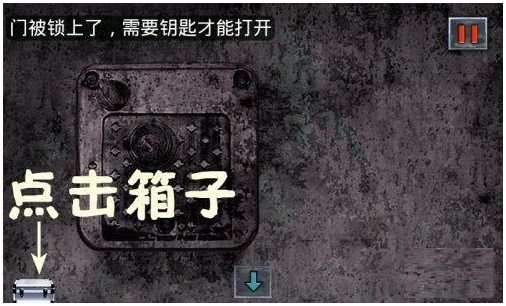 之后会进入箱子的界面,在里面有我们刚才捡到的黑色手机。其实这个箱子就是我们的一个物品栏。游戏中收集到的物品都可以在这里找到,根据提示,点击箭头所指的地方。