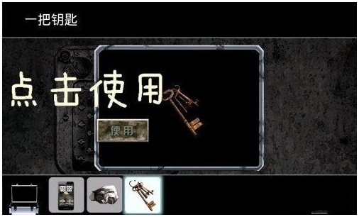 这个时候我们再点击前面的大门,游戏会给出相应的提示:门被锁上了,需要钥匙才能打开。之后我们打开左下角的工具箱,在里面找到刚才获取的钥匙。此时可以发现工具箱里还有手机、石头,但断线钳没了。