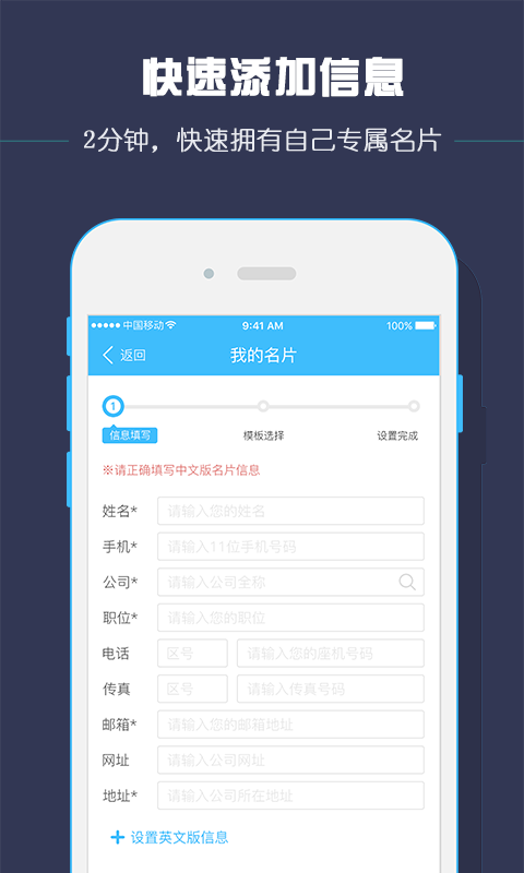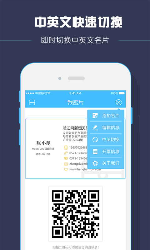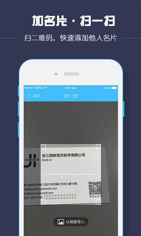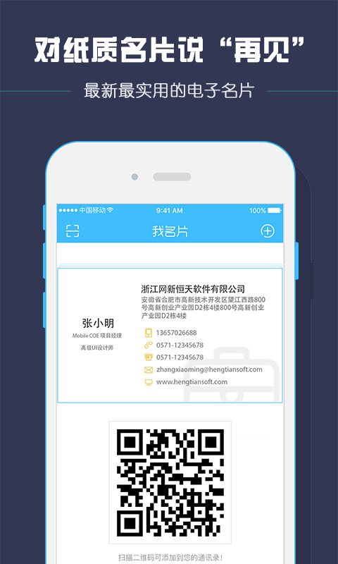 出门在外,你还在为名片遗忘在家而懊悔吗?你还在为名片发完了没有复印而焦急吗?一张名片就是一次机会。你还在担心身边没有名片而错过吗?不用担心,“我名片”来帮你忙。“我名片”是一款通过输入个人信息来生成电子名片的应用。它可以根据你输入的信息即时生成一张电子名片和一张有着你信息的二维码名片。其他人可以通过扫描你的二维码获取你的名片信息并保存。