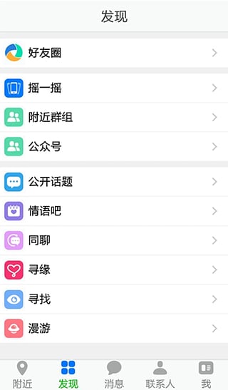 免费通讯文字,图片,语音等等,搜索显示附近的人和群组,公众号(公司、团体、个人的公开号),公开话题(你说的话题大家都可以看到受到大家的关注和回复),情语吧,同聊室(同志们的聊天交友乐园),寻缘(找对象,找恋人),发布寻人、寻物、认领,好友圈,摇一摇,实时距离,漫游各地等等功能。