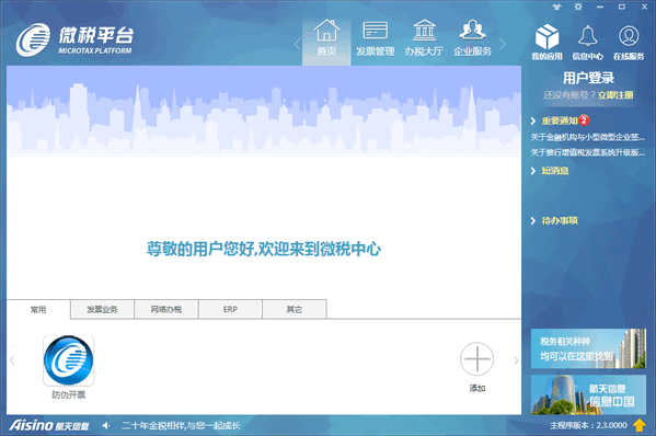 主界面右侧中部是信息提示区。微税平台向您第一时间推送的平台动态、税法通知、精彩活动、提醒事项等信息在这里显示,包括重要通知、短消息、待办事项等,用户点击标题可以可以查看详细内容。