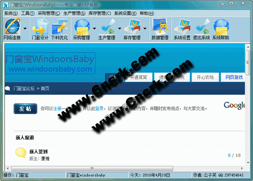 免费门窗ERP软件门窗宝 功能 1,门窗设计 2,项目管理 3,项目预算/报价 4,下料优化 5,采购管理 6,库存管理--原材料库/成品库 7,期待您的建议 用户名:门窗宝 密码:110