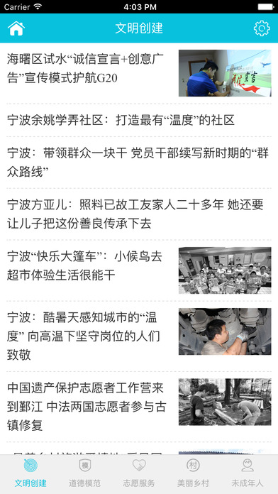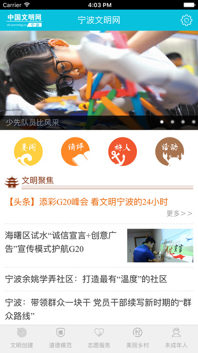 文明宁波ap由宁波市市文明办主办的宁波文明网、微信、微博基础上,构建完善“一网两微一端”文明传播体系的重要举措,也是宁波文明创建工作适应新形势,努力拓展覆盖人群、积极创新创建手段的一次探索和尝试。文明宁波app不仅可以最便捷最及时地了解宁波文明创建权威信息,而且可以为品质社区、最洁美村庄等投票,为宁波好人、道德模范点赞,为打造东方文明之都献计献策,有力地推动文明创建工作全民参与。