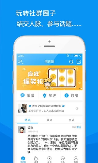 通过慢慢的使用小编发现这是一个不错的培训平台,在这里可以让培训没有界限,可以实现沟通零障碍,同时还可以让培训零收费,更省时、省力、省钱。后来由于好奇,小编又开点了“培训侠”App上的培训圈,结果发现在这里每天都会有相关人士发布的培训活动等,只要感兴趣,可随时点开报名参加。