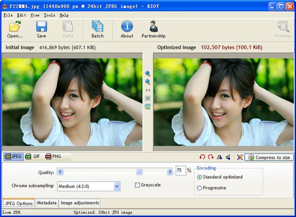 RIOT是一款小巧的图像优化工具,软件只有1M大小,并且它是免费的。它可以用来调整图片内容的压缩比,对图片质量进行优化,从而达到减少文件大小的目的。