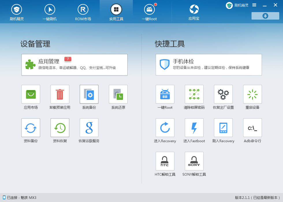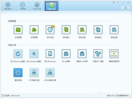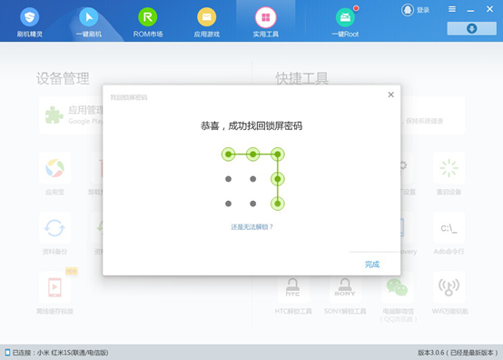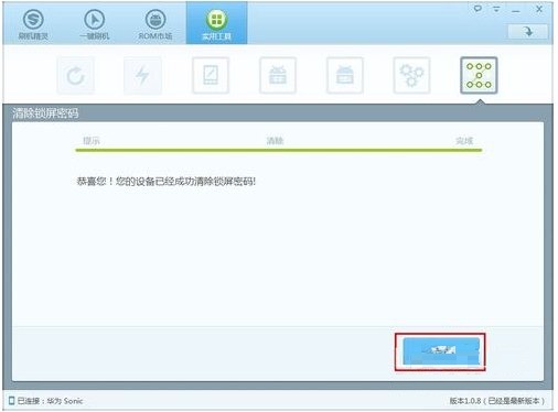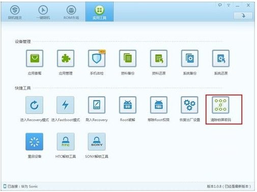 4、安装完成后直接运行手机密码破解工具,如果程序会自动搜索并下载安装与当前手机匹配的驱动程序。 驱动安装完成后,点击主界面上方的“实用工具”选项卡。