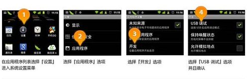 2、首先用数据线将手机与电脑的USB接口相连,并按如图所示打开手机“USB调试”模式。