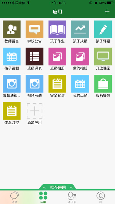 叠加天翼学生证功能,整合平安短信、亲情电话、易信群,实现全方位家校互动。