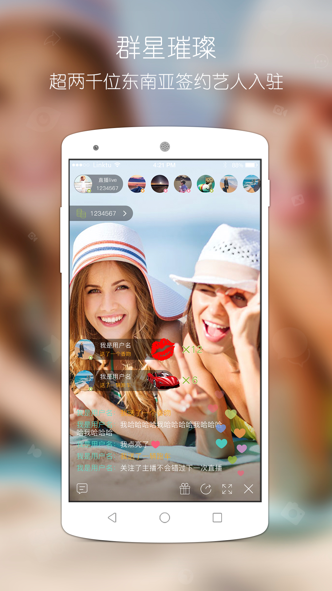 【颠覆传统社交模式】拍照、视频、加好友、聊天、附近、直播,强大精致的一站式交友软件【东南亚各国艺人齐助阵】超2000位东南亚签约艺人入驻,带你看不一样的世界