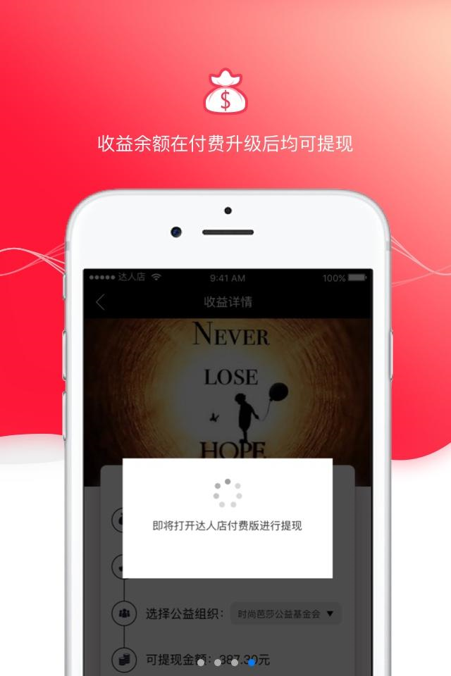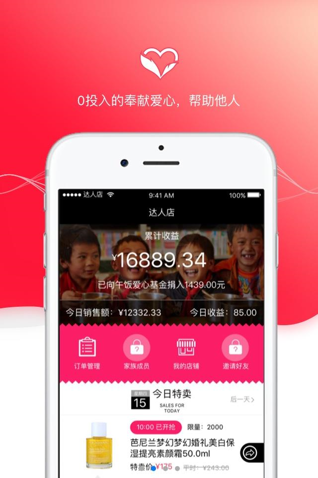 1、达人店公益版为新用户免费开店,提供以社交流量促进交易的轻创业体验机会。2、达人店与多家著名公益组织合作,店主可以选择将所得收益进行捐款,0投入的奉献爱心,帮助他人。