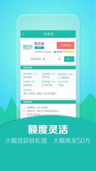 1.放款快:1分钟快速申请,审核通过当天放款。2.超低月息:综合比较为你推荐最优贷款方案,每月享超低月息,低息才是硬道理。