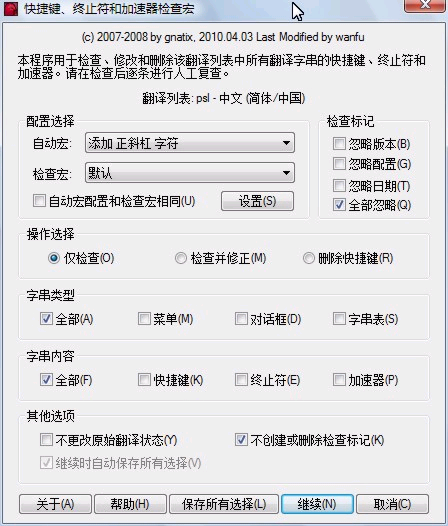 用于Passolo翻译字串中的快捷键、终止符和加速器的检查、添加和修改,使其和原文保持一致;并具有删除翻译字串中的快捷键功能。