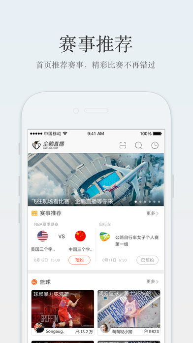 首页直播:推送当前最最最热门的体育赛事直播内容。体育分类:NBA,篮球,足球,台球,乒乓球,网球,羽毛球,健身,舞蹈,赛车…,每一个体育分类下,均有主播在做体育直播。