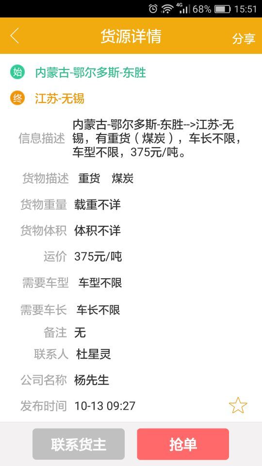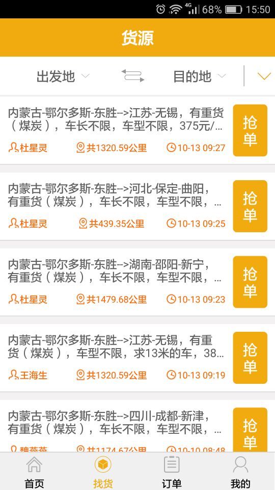 货主发布货源后,司机一键抢单,平台发送短信实时通知货主。