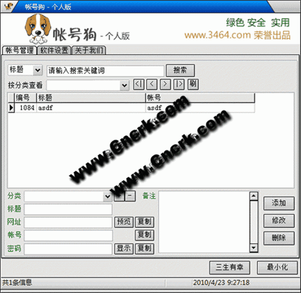 帐号狗个人版帐号密码管理软件,功能强大、使用方便、界面美观。 帮助你解决各种密码的记忆和管理。 让你方便,安全的登录网站、论坛、邮箱和软件。密码经过多重加密,即使数据库被打开 默认管理密码:admin