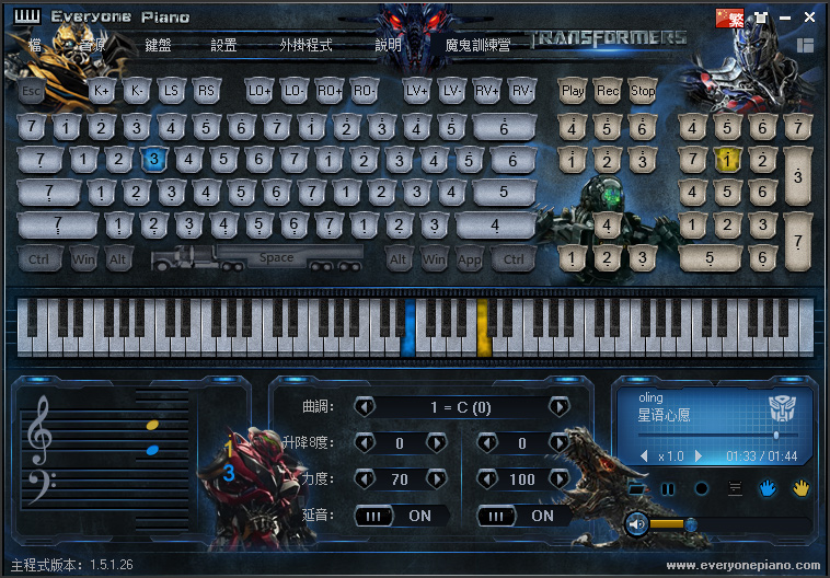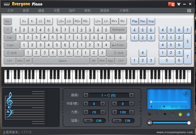 支持录音、放音、乐谱显示、移调、8度音区调整等多项功能。