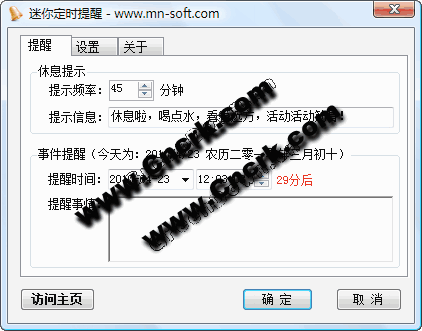 迷你定时提醒工具可以设置时间间隔循环提醒,指定时间提醒,不过时间间隔不要太近了,这样的工具其实不适合给编程工具者,很容易打断思路,工作上不能太投入认真。也容易让Boss不喜欢 。
