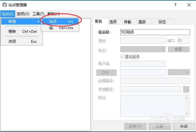然后先填写站点信息中圈出的4项(匿名登陆则只填其中两项),再选填远程路径(在服务器上的位置)和本地路径(连接后本地自动跳转到哪个位置),最后点击下方的“应用”。