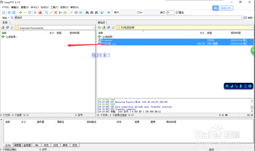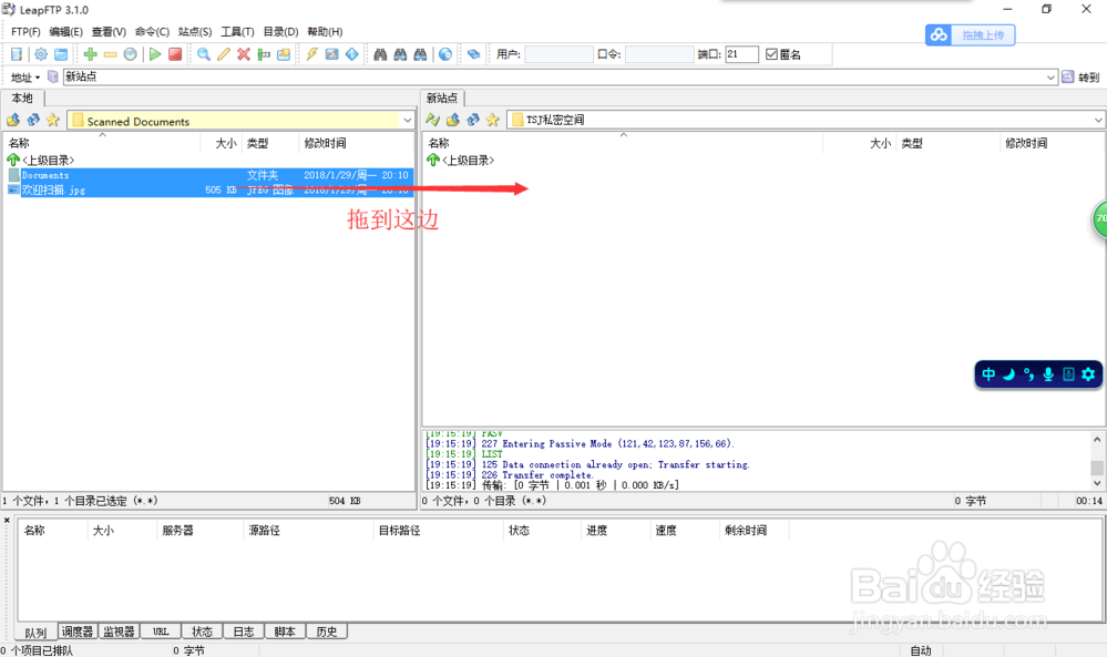 之后,可以直接点击下方的“连接”来连接到指定的FTP网络位置。只要各项信息正确无误,就可以连接上FTP位置啦!连接好之后,将您要传输的文件选定,然后拖动至你要上传至的远程目录,就可以上传了!当然,若从远程拖到本地,就可以实现下载。