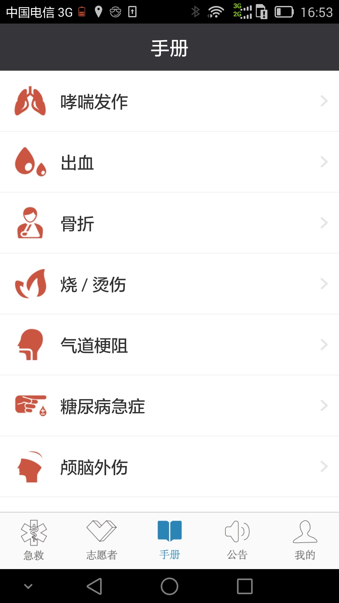 3.急救手册,方便您随时查阅学习急救知识;求助功能,方便浏览地图,了解自己所处的具体位置,在紧急情况下,可以快速向亲友发出求助信号;公告功能,每天向您提供急救、保健类知识。未来增加医疗咨询和问诊等服务。