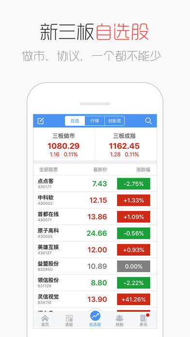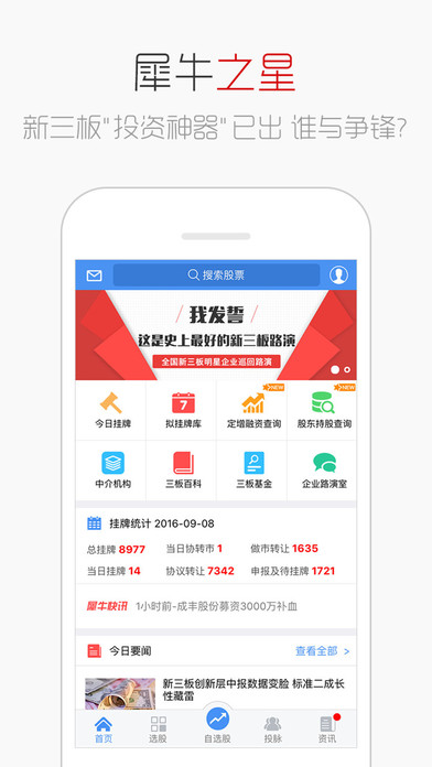 犀牛之星为用户提供新三板自选股添加功能,自选股作为新三板市场参与各方必备功能,可支持分时、日K、周K,月K及买卖五档价格、企业市值、市盈率、换手率等查询。